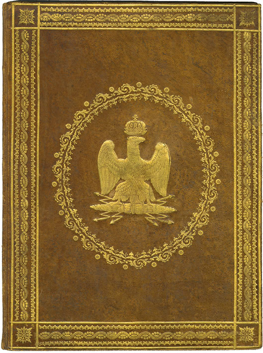 RELIURE AUX ARMES.« Lettera pastorale » de Bernardo Della Torre. Napoli, nella stamperia Simoniana [probablement 1807] ; in-4°, 14 pages -2 blanches. Basane fauve marbré, dos lisse orné d’une frise de rubans et de fleurs dorée, large encadrement...