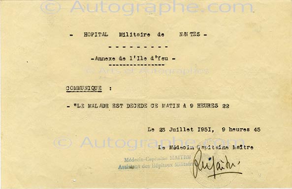 Communiqué du décès du maréchal Pétain à l’île d’YeuCommuniqué original du décès du maréchal Pétain à l’île d’Yeu, le 23 juillet 1951 ; 1 page in-8° Certificat original affiché à l’île d’Yeu, signé par le médecin capitaine Maître. « Communiqué : “Le Malade est...