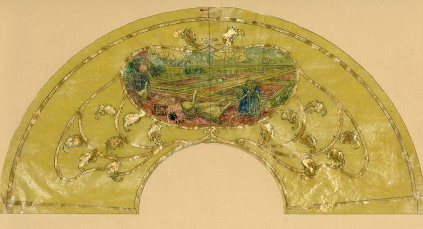 Aquarelle en forme déventail sur papier calqueFillettes aux oies dans un parc.Aquarelle en forme déventail sur papier calque.Signée au milieu du tampon à son monograme.Datée 190222,5 x 44 cm.