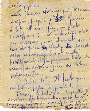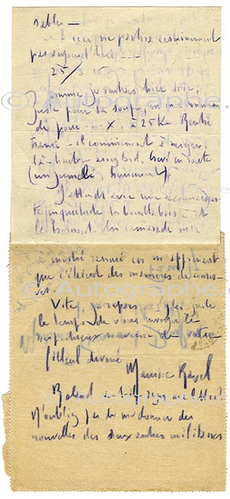 Lettre autographe signéeLettre autographe signée, adressée à sa marraine de guerre, Mme Fernand Dreyfus. 17 mars 1916 ; 4 pages in-12 au crayon violet. Ravel est alors conducteur aux convois automobiles. Parti de Viroflay, il n’a pas eu beaucoup de temps pour...