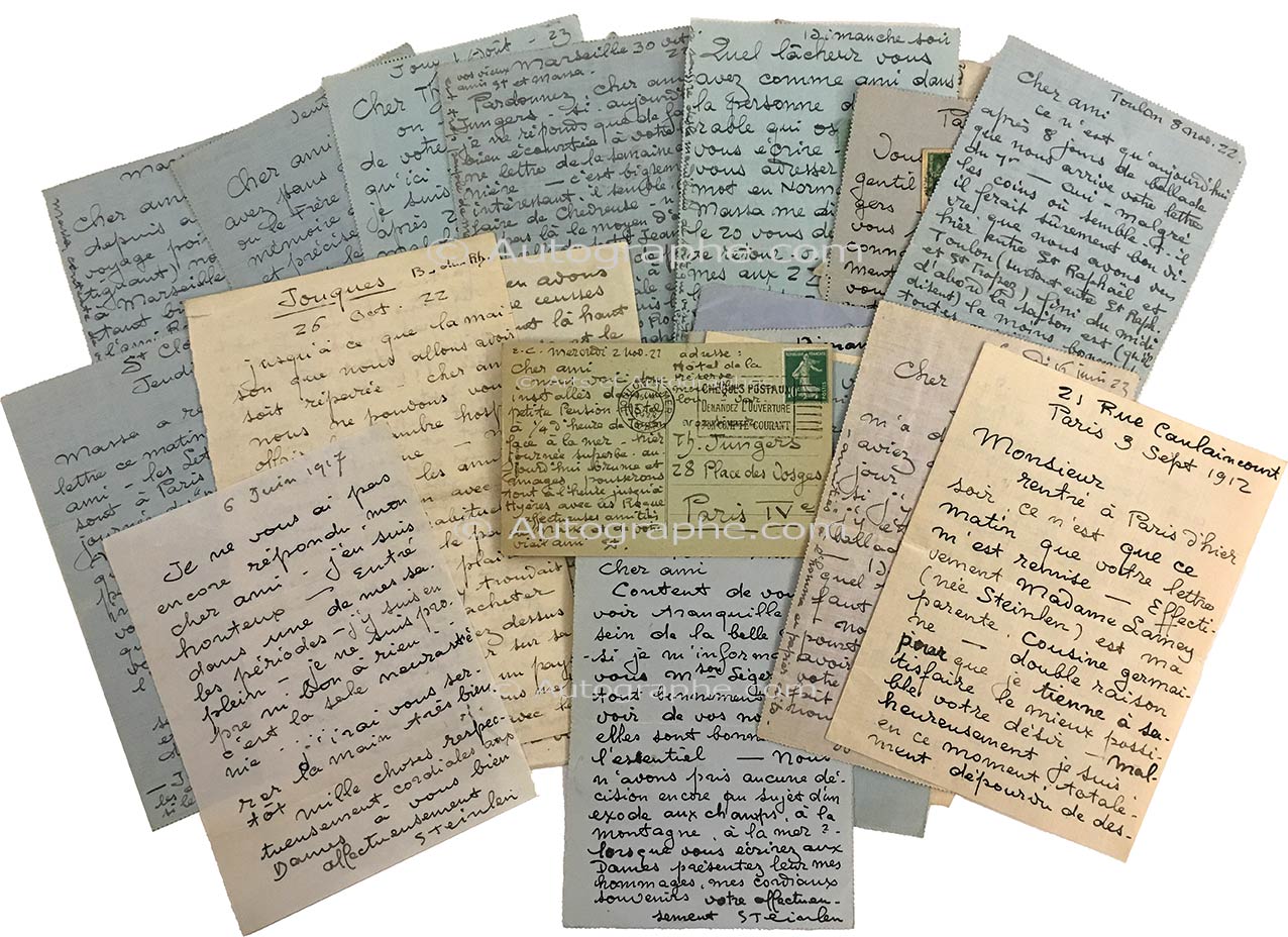 Lettres autographes signéesCorrespondance de 27 lettres autographes signées, adressées à Théo Jungers (peintre animalier). De 1912 à 1923 ; formats in-8° principalement. On joint un dessin à l’encre et au lavis représentant le mont du Golgotha avec les...