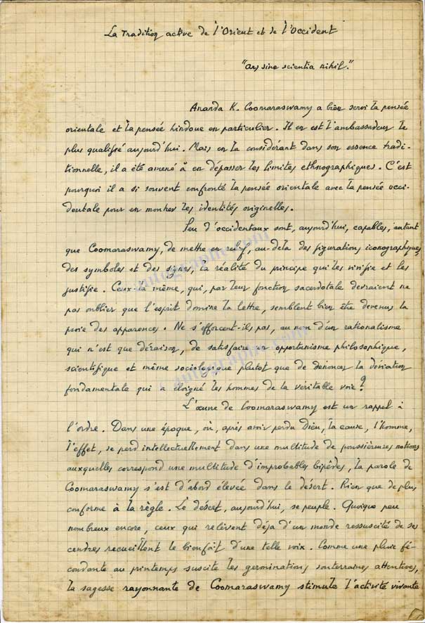 Manuscrit autographe signéManuscrit autographe signé « La tradition active de l’Orient et de l’Occident ». Saint-Rémy-de-Provence, avril 1946 ; 10 pages 1/2 in-folio. Intéressant manuscrit concernant l’oeuvre d’ Ananda K. Coomaraswamy. Comparaison...