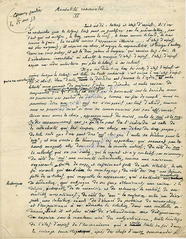 Manuscrit autographe signéManuscrit autographe signé « Mentalité renouvelée ». 9 pages in-folio. Manuscrit d’un article publié dans L’Atelier de la Rose, Lyon, juin 1953. Concernant le talent du peintre, il contient aussi une discussion sur le rôle de...