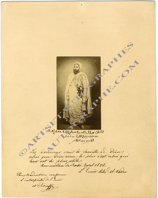 Photographie dédicacéePhotographie dédicacée. 90 X 55 mm dans un feuillet cartonné de 240 x 189 mm.Rare portrait photographique ancien le représentant, tirage sépia monté sur carton avec dédicace autographe signée. Texte en arabe avec traduction en...