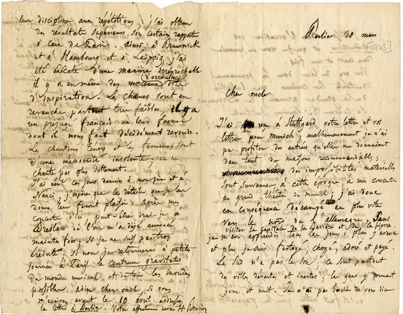 Lettre autographe signéeLettre autographe signée, adressée à son oncle Félix Marmion. Berlin 30 mars [1843] ; 4 pages in-8° (21,6 x 13,9 cm) sous chemise demi-maroquin rouge.Belle lettre sur son premier séjour en Allemagne et ses premiers succès à...