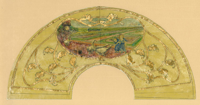 Aquarelle en forme déventail sur papier calqueFillettes aux oies dans un parc.Aquarelle en forme déventail sur papier calque.Signée au milieu du tampon à son monograme.Datée 190220 x 39 cm.