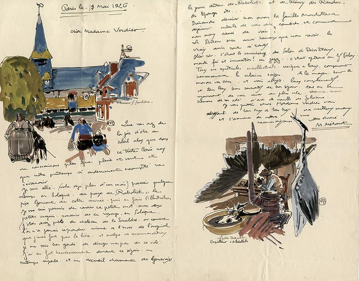 Lettre autographe signéeLettre autographe signée, illustrée de 2 dessins signés, adressée à Mme Verdier. Paris, 11 mai 1926 ; 31 x 40,6 cm.Très belle lettre évoquant Raboliot de Maurice Genevoix.« Que vous avez de la joie dêtre au soleil alors que...