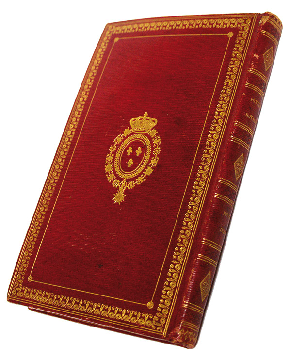 « ÉTAT GÉNÉRAL DES POSTES DU ROYAUME DE FRANCE », suivi de la carte géométrique des routes desservies en poste, avec désignation des relais et distances, pour l’an 1820. Paris, Imprimerie Royale, 1820 ; in-8°. Très belle reliure plein maroquin rouge à grains longs, plats aux armes royales entourées d’une roulette de frises dorées, roulette intérieure, garde de moire bleue, tranches dorées. Ex-libris en lettres dorées avec armoiries sur fond rouge de La Bédoyère. Époque Restauration. Ouvrage bien complet de la grande carte dépliante aquarellée. Très bel exemplaire en maroquin rouge de l’époque aux armes de Louis XVIII. (Autres photographies sur demande).