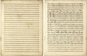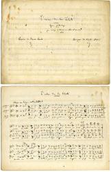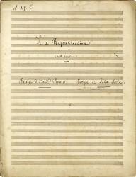 MASSÉ Victor (Félix-Marie dit)Manuscrit musical autographe « La Républicaine - chant populaire - Poësie d’Edouard Plouvier. Musique de Félix Marie » [Victor Massé gratté].Page de titre et 8 pages in-folio (35 x 27 cm).« Oublions ce blasphème qui nomme l’orgueil des rois, un droit venu du ciel, le droit divin c’est celui de tout homme qui fait sa part dans l’oeuvre universelle. »Édouard Plouvier [Paris, 1821 - id., 1876], était un poète, écrivain, librettiste et goguettier français.