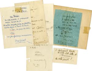 MASSENET JulesEnsemble de 5 lettres autographes signées et 3 cartes de visite. De 1900 à 1912 ; formats in-8° principalement, trous d’archivage : « Je suis à la campagne & vais partir pour les eaux. Écris-moi à Paris & je te répondrai de suite. » ; « Avec grand plaisir, je réponds à votre désir de venir me voir en vous disant : à mercredi 1er mai. » ; « Amis bien chers, je vous unis toujours dans ma pensée et dans mes souvenirs. » ; « Vos belles nouvelles, si gracieusement envoyées, me sont ma joie. Vos artistes auxquelles j’adresse mes félicitations sont bien heureux de revoir vos conseils. À tous, mes pensées bien émues. À vous, ma plus affectueuse reconnaissance. » ; « Amis si bons, vous me consolez de la vie si triste... ».