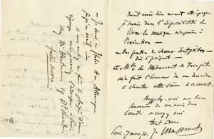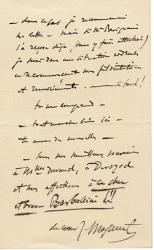 MASSENET JulesLettre autographe signée. 15 février 1882; 2 pages in-12. « Est-il vrai que le Maestro Bevignani n'ait pas reçu ma lettre ? Je lui avais écrit au moment de la Première (après tes excellentes dépêches), une lettre officielle pour lui, pour l'orchestre, pour les choeurs, pour la danse ! rien de tout cela n'est parvenu et je suis dans mon tord - j'enrage! - veux tu me prévenir dans ce cas je recommencerai ma lettre. Mais si M. Bevignani l'a reçue déjà, (sans y faire attention) je serai dans une situation ridicule en recommençant mes félicitations et remerciements si tard ! Tu me comprends. Tout marche bien ici. Tu auras des nouvelles. Tous mes meilleurs souvenirs à Mlle Durand, [ ] et mon affection à ce cher et brave Barbaccini ! »