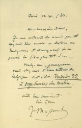 MASSENET JulesLettre autographe signée (adressée au Baron Paul Ramond). Paris, 12 X 1887 ; 1 page in-12°. Jules massenet s’excuse d’avoir raté son rendez-vous et fixe en un autre chez lui pour le « Vendredi 22 à onze heures du matin. »