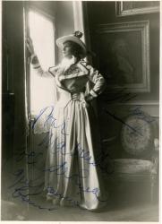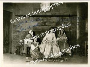 MARQUET Mary (Micheline Marie Marguerite, dite)Photographie autographe signée, dédicacée à Lina Wolf. 232 x 173 mm. « Pour Lina, son amie Mary Marquet ». Photographie la représentant sur scène. Cachet du photographe au dos « Photo Gaston et Lucien Manuel ». Très beau cliché.