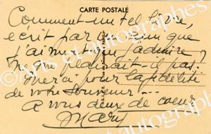 MARQUET MaryCarte autographe signée. 1 page in-12 oblongue au dos d’une carte postale la représentant. « Comment un tel livre, écrit par un ami que j’aime et que j’admire ne me plairait-il pas ? Merci pour la fidélité de votre souvenir... A vous de coeur. Mary. »