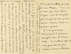 MARTY Edouard Jean Baptiste noelLettre autographe signée adressée à Mr Rochet (marchand de pastels). Tournemire, 15 juillet 1901 ; 2 pages in-8°. Lettre au sujet d’une traite, dont il souhaite reporter l’échéance. « Je recois communication de votre facture en date du 30 juin. Je suis bien en retard cette fois avec vous. Je vous prirais toutefois de vouloir bien ajourner au 31 Août la traite que vous vous disposez sur moi. Je vous serais très reconnaissant de me rendre ce petit service, et j’ose espérer. que vous ne refuserez pas à un vieux client qui vous a déja fait des commandes considérables et vous en fera encore. Je ne vous cacherai pas que si vous pouviez même attendre au 15 septembre vous me feriez grand plaisir. Décidez à cet égard comme vous voudrez ! Je me mettrai en mesure pour le 31 aout s’il le faut et bien que cela me gène selon toutes les prévisions ».