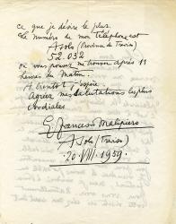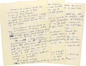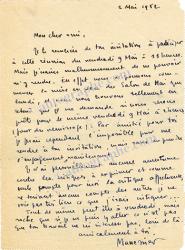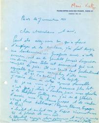 MANÉ-KATZ EmmanuelEnsemble de deux lettres autographes signées adressées à Raymond Nacenta, directeur de la galerie Charpentier. — Paris, le 5 mai 1949; 2 pages in-8° avec trous d’archivages. « Comme suite à vos entretiens sur une éventuelles exposition ans votre galerie, j’ai le devoir de vous faire part de ma décision d’attendre un autre moment, quand vous jugerez la situation plus favorable pour que je fasse la grande exposition, dont nous avons parlé durant une année. Faire une exposition restreinte dans une salle du 1er ne peut pas être de ma convenance et je préfère de beaucoup attendre faire une grande exposition chez vous (tel que j’ai déjà fait en 1937) et pour laquelle je me prépare depuis que j’ai parlé avec vous en ce sens. J’espère donc que ce n’est que partie remise, en attendants je participerai volontiers à vos manifestations de groupe ou autres. Je vous pries de croire monsieur,l’expression de mes sentiments les plus distingués et dévoués Mané-Katz. »— Paris, le 7 novembre 1951 ; 1 page in-8° avec trous d’archivages.« Cher Monsieur et ami, peut être avez-vous su qu’a force d’employer de la couleur, j’ai fait rougir ma bonbonnière... Quelques amis, à cette occasion, ont eu la gentille pensée d’organiser un dîner pour fêter cet événement qui me remplit de joie. Il me serait tout particulièrement agréable que vous acceptiez d’être mon invité le 21 (a 20 heure) à la coupole. J’espère bien en votre réponse favorable. Si je ne vous ai pas prévenu plus tôt, c’est que j’allais à Londres, pour mon exposition à la Redfern Gallery où j’ai eu le plaisir d’avoir une très bonne presse et de vendre vingt deux tableaux! [...] Mané Katz »
