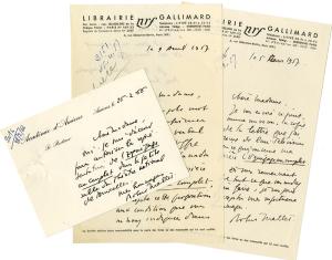 MALLET RobertEnsemble de 2 lettres autographes signées, adressées à une femme. En-tête « Librairie Gallimard — NRF » : — 5 mars 1957 ; 1 page in-8°. « Je vous envoie ci-joint comme convenu, la copie de la lettre que j’ai reçue de Paris-Télévision en ce qui concerne ma pièce L’Équipage au complet. »— 9 avril 1957 ; 1 page 1/2 in-8°. « Un simple mot pour vous confirmer mon accord verbal à propos de l’offre faite par Télé-Canada de téléviser ma pièce L’Équipage au complet. J’accepte cette proposition aux conditions que vous m’avez indiquées dans votre lettre. »On joint une carte autographe signée autorisant la représentation de ladite pièce au Théâtre national de Bruxelles.
