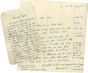 MAULNIER Thierry (Jacques Louis Talagrand, dit)Ensemble de 3 lettres autographes signées, adressées à Jean Cayrol : Sans date ; 2 pages in-8°. « Une maison dédition qui prépare un ouvrage sur ma peinture me demande si je ne pourrais pas vous écrire afin de vous demander un texte dune vingtaine de pages (dactylographiées), texte très libre, non pas une étude critique, mais un texte qui serait comme un accompagnement amical, dans une forme à votre choix, enfin ce qui pourrait le mieux vous intéresser, vous amuser décrire à propos dun peinte, ou de sa peinture, de près ou de loin. Personnellement je trouve cette idée excellente et je vous la communique. » 19 mai 1955 ; 1 page 1/2 in-4°. « On vient de me remettre la copie de votre texte. Jétais très impressionné, et je suis descendu le lire à Thérèse. Cétait là, la voix dun ami que nous entendions ! Et si javais vu faire un tout petit peu ce que vous dites, cela me consolerait de beaucoup de peines endurées ! Nous sommes des hommes de la réalité-et-de-lespoir-malgré-tout, mon cher Cayrol ; et cela, nous le resterons grâce à ces petits riens, peut-être que Dieu a placé si mystérieusement dans notre bagage et qui nous permettent de lentendre murmurer son Amour, au travers de limmense cri de notre XXe siècle. En tout cas, je vous remercie, Cayrol, de mavoir ainsi donné rendez-vous au coin du pré. » 7 janvier 1956 ; 1 page in-4°, pli fatigué. « Merci de vos bons voeux, recevez les miens pour vous et votre mère que jespère en bonne santé. Jespère avoir la joie de vous voir un peu plus souvent cette année... car lamitié que jai pour vous réclame un peu plus que des difficultés dédition ! Nous nattendrons pas la moitié de ce malheureux petit livre pour vous avoir un soir à la maison. »