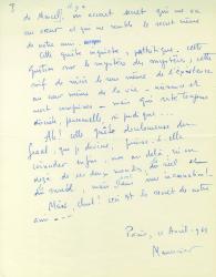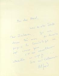MANESSIER AlfredLettre autographe signée « Alfred » adressés à Marcel Schneider ; 1 page in-4° « Merci de votre article sur Zurbaran qui me donne très envie de descendre jusqu’à la Guaudeloupe en sept. comme prévu. C’est une merveilleuse introduction au voyage. »
