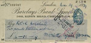 LYDIS MarietteChèque autographe signé. 29 décembre 1939 ; 1 page in-16 oblongue. Chèque sur la banque Barclays pour Simpsons Piccadilly. 3 lignes autographes signées.