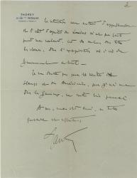 LYAUTEY Louis Hubert GonzalveLettre autographe signée, adressée à son cousin. Tours, le 20 décembre 1902 ; 6 pages in-8°. En-tête gravé à son adresse. Il est venu à Tours pour régler sa situation financière (difficile) après le décès de Diener. « Mais pour la commande que vous avez faite à Diener directement, puisque vous ne croyez pas devoir apporter la moindre atténuation à l’engagement irréfléchi que je me suis trouvé avoir pris par une phrase écrite au courant de la plume, dans les circonstances des préoccupations de guerre […], je vous demande au moins la permission de vous ramener aux termes précis de cet engagement que vous m’avez remis sous les yeux. […] Je vous ai dit que dans le cas de l’insuffisance de l’actif de la succession de M. Diener, je m’engageais à vous couvrir la différence. Vous partez de là pour me demander le remboursement de l’intégralité de votre créance Diener, et vous me demandez d’accepter à cet effet des traites. Il m’est impossible d’admettre ce mode de liquidation de cette succession dans le passif de laquelle vous figurez personnellement. […] Croyez que je regrette de ne pouvoir vous apporter un service plus efficace dans le fâcheux état de vos affaires que vous me faites l’amitié de me confier. »
