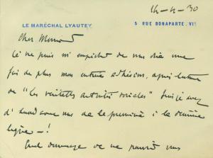 LYAUTEY Louis Hubert GonzalveCarte autographe signée adressée au redacteur en chef du “ Gaulois ”. Paris, 14 avril 1930 ; 2 pages in-8° sur une carte avec en-tête et adresse. Il approuve l’article “ les véritables autorités sociales ”. « Je ne puis m’empécher de me dire une fois de plus mon entière adhésion après lecture de “ les véritabes autorités sociables ” Suis je assez d’accord avec vous de la première à la dernière ligne. Quel dommage de ne pouvoir vous rencontrer dans cette maison de “ Figaro ”. »