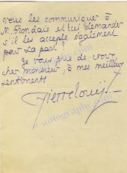 LOUŸS Pierre (Pierre Louis, dit)Lettre autographe signée. Tamaris, 16 novembre 1910 ; 1 page ½ in-12.« J'ai appris avec un douloureux sentiment la mort de M. Robert Gangnat [1867-1910, de la Société des Auteurs et Compositeurs dramatiques] et je tiens à vous adresser mes condoléances très sincères. Votre lettre du 14 me parvient aujourd'hui. En ce qui me concerne, j'accepte les propositions italiennes que vous me transmettez. Voulez-vous les communiquer à M. Frondaie, et lui demander s'il les accepte également pour sa part ? »Mention au crayon bleu, d'une autre main : « Femme & le Pantin [...] Frondaie 18-11-10. »Pierre Frondaie [Paris, 1884 – Vaucresson, 1948], auteur dramatique, fut le co-auteur avec Pierre Louÿs d'une adaptation théâtrale de La Femme et le pantin, qui fut jouée à Paris à partir de décembre 1910.