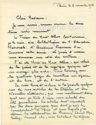 LOUŸS Pierre (Pierre Louis, dit)Lettre autographe signée, adressée à M. Chauvin de la Société des Auteurs et Compositeurs. 25 octobre 1910 ; 2 pages in-8°. Sur La Femme et le Pantin. Il demande quand aura lieu le premier versement, la nature du second. « Je ratifierai la convention mais puisque d’autres sont projetées, j’espère que Miss Andrews voudra bien pour les suivantes ne pas vous présenter un ultimatum avec un délai de trois heures quand je suis absent de Paris. Tamaris a un bureau de télégraphe ouvert jusqu’à 7 h du soir, et en cas d’urgence, je puis télégraphier de Toulon toute la nuit. Une dépêche de vous aurait donc facilement une réponse le jour même, ou au plus tard le lendemain matin ».