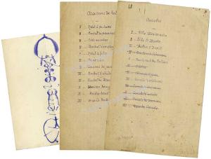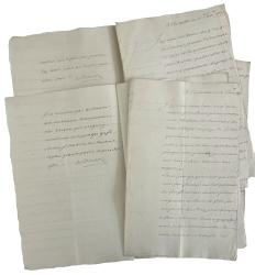 LOUŸS Pierre (Pierre Louis, dit)DOSSIER ÉROTIQUE : ensemble de 6 pièces autographes. Sans date ; 1 page in-12 chacune :— Dessin signé. Sans date ; 1 page in-16. Dessin à l’encre violette, symétrique, obtenu après pliage. Dessin érotique représentant un phallus.— Poème érotique autographe. Sans date ; 1 page in-4°, à l’encre violette.« Passe moi ta carotte, Alice,Berthe a crevé mon saucisson.Oh ! qu’elle est rouge et ronde et lisse !Dirait-on pas un beau garçon ? »— 1 pièce autographe intitulée « Cocottes » « I. Fille Montmartre, II. Fille Saint-Martin, III. Trottin St Denis, IV. boulevard Sébastopol. »— 1 pièce autographe intitulée « Maisons de tolérance » « I. Hôtel à putains, II. Bordel de pauvres, III. Cités ouvrières, IV. Bordel d’employés. »— Pièce autographe. Sans date ; 1 page in-4°.« Philis ayant un peu trop buChantait en relevant sa jupeJusqu’au-dessus du trou barbu.J’empoignai le con par la huppe ;Et comme j’y fourrais mes doigts,Elle me dit d’un air salace :“ Si tu faisais ce que tu dois,Tu mettrais ta pine à la place” »— Lettre autographe signée, adressée à une femme. « Dimanche, dès l’aube » ; 2 pages in-8°. « Je vous en prie à genoux : soyez assez bonne pour m’envoyer ce matin par les voies pneumatiques les plus rapides une adresse que je ne trouve pas dans les vingt-cinq mille volumes de ma bibliothèque — l’adresse de Madame Narischkine, née Alexandra de Zarneckau d’Oldenbourg. […] Je vous remercie, je m’excuse et comme j’ai commencé cette lettre à genoux, je ne changerai pas d’attitude pour la terminer respectivement à vos pieds. »