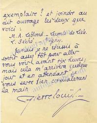 LOUŸS Pierre (Pierre Louis, dit)Lettre autographe signée, adressée à Alfred Vallette. 1er décembre 1916 ; 2 pages in-12. Il demande un exemplaire de la traduction de Keats, des ouvrages de Leblond et Séché consacrés à Leconte de Lisle et Vigny. « Vous avez édité une traduction de Keats que j’ai reçue et qu’il m’est impossible de retrouver, peut-être parce que j’aime trop les vers de Keats pour les lire en prose, mais je voudrais montrer ce livre à quelqu’un. »