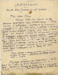 LOUS Pierre (Pierre Louis, dit)Manuscrit autographe (minute) [adressé à Paul Valéry]. [24 juin 1917] ; 2 pages petit in-4° à lencre violette.« Montesquieu. Peut-être ignores-tu ce exorde :Très chers FrèresLorsque Isaïe fut inspiré de la fameuse apostrophe aux streptocoques : Tressaillez dallégresse, habitants de la poussière ! Expertgiscimini qui habitatis in pulvere ! (Is. XXVI.19); quand le saint prophète Malachie (II.3) cria ce texte sacré [ ] verset que je nose point traduire en lanque vulgaire [Pierre Louys cite ici le Père Gratry et sa Méditation sur le Temple de Gnide.Louÿs affirme que depuis quinze ans « Montesquieu garde le n° 1 [ ] Deux raisons : les Pensées et fragments inédits, [ ] un des livres que je connais le mieux. la règle : dire ce que lon veut dire ». Et il loue la vérité et la justesse dune phrase extraite de ces fragments sur « lart de la conversation », quil commente...