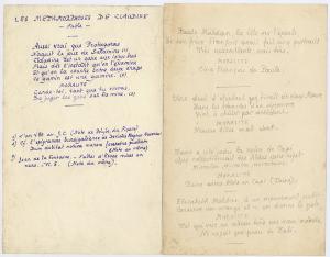 LOUS Pierre (Pierre Louis, dit)Ensemble de 2 manuscrits autographes de poèmes. 1 page in-8 chaque. Amusantes fables-express au crayon concernant des membres de sa famille maternelle, les Maldan : « Paule Maldan, la tête sur lépaule,De son frère François avait fait cinq portraitsTrès ressemblants, mais très. MoralitéCinq François de Paule ». Etc. Les Métamorphoses de Claudine, Fable, à lencre violette avec notes. 1 page in-8°« Aussi vrai que ProtagorasNaquit le jour de Salamine (1)Claudine est un gosse aux longs brasMais dès linstant quon lexamineEt quon la couche entre deux drapsce gamin est une gamine. (2)MoralitéGarde-toi, tant que tu vivras, de juger les gens sur la mine (3) »