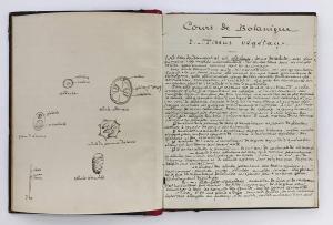LOUS Pierre (Pierre Louis, dit)Manuscrit autographe intitulé « Cours de Botanique ». [Circa 1884-1885]. Cahier petit in-4° (22,3 x 17,8 cm) de 60 pages, reliure cartonnée dos toilé rouge d'origine (à la marque Papeterie des Étudiants et de l'Odéon F. Bénard). Ancienne collection Louis Barthou (Ex-Libris). Précieux manuscrit sous forme d'un cahier d'écolier illustré de plus de soixante dessins du jeune Pierre Louÿs. En titre, Louÿs avait écrit en majuscules à l'encre rouge : « Histoire de la littérature grecque », mais a utilisé ce cahier pour le Cours de Botanique. Chaque leçon (Tissus végétaux, La Racine, La Tige, La Feuille, La Fleur, Le Fruit, La Graine, Germination, La Sève, etc.) est illustrée sur la page qui lui fait face par des dessins et des croquis à la plume, tous légendés : coupes de tiges, racines diverses, branchages, palmier, fleurs, champignons, toutes sortes de végétaux, de graines, etc. Le cahier contient encore son buvard d'origine, et un petit feuillet in-12 sur lequel le jeune Louÿs a noté le classement des 30 élèves de sa classe à la composition en Botanique, lui-même arrivant 8e.