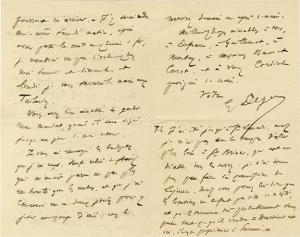 LIORAT Armand (Georges Degas, dit)Lettre autographe signée. Paramé, Villa Sans-souci mardi 28 juillet 1885 ; 3 pages in-8°, enveloppe timbrée jointe.« Voici mon congé qui touche à sa fin : lundi je reprends le collier. Ayez donc l’obligeance de ne plus rien m’envoyer ici à partir de demain mercredi, car mon intention est de rentrer par le Mont St Michel, et de quitter Paramé jeudi soir. Je recevrai jeudi matin mon dernier courrier, celui qui sera parti la veille au soir de Paris avant 5h. Après cela, c’est à Sceaux que je vous prie d’adresser les lettres qui pourraient m’arriver. J’y serai rendu moi-même samedi matin, après avoir passé la nuit en chemin de fer […]. J’ai été jusqu’à St Lunaire, mais je n’ai pas eu le temps d’aller plus loin à St Briac, qui est au diable dans les terres. Je n’ai donc pas pu faire la commission de Lejeune ».