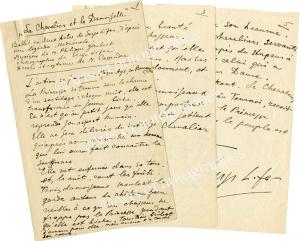 LIFAR SergeManuscrit autographe et 2 documents.— Manuscrit autographe signé (sans lieu ni date) ; 4 pages in-8°. « Le Chevalier et la Damoiselle ». « Ballet intitulé en 2 actes de Serge Lifar, d’après une légende médiévale […] L’action se passe au Moyen-Age, en Bourgogne. La princesse se trouve sous le charme d’un sortilège: chaque nuit, elle est transformée en jeune biche […] elle ne sera délivrée qu’après avoir rencontré un homme qui lui aura fait connaitre la souffrance ». Ballet de Serge Lifar, Musique de M.Philippe Gaubert, chorégraphie de Serge Lifar, décors et costumes de M. Cassandre. Ce ballet fut donné à l’Opéra de Paris le 2 juillet 1941.On joint :— Lettre autographe signée. (s.l.) 29 août 1943 ; 1 page in-folio. Lettre amicale dans laquelle il remercie un ami pour son avis sur « Suite en Blanc » (ballet Néo classique de Serge Lifar) « venant de vous, cette opinion est d’autant plus flatteuse […] Ne croyez-vous pas, mon cher ami, que le grand défenseur de Notre danse académique que vous êtes - devrait prendre la plume pour répondre aux attaques de Divoire contre nous […] Je compte sur vous pour la citation de Duncan!?»— Une fin de lettre signée, adressée à la ballerine russe Galina Sergueevna Ulanova [1909-1998]. (S.l.n.d.) ; 1 page in-4. Lettre avec quelques corrections autographes. « La pureté de votre ballet, sa naïveté nous remplissent d'admiration de fierté et d'amour […] La création est un miracle, une révélation, une transfiguration même de l'être dans cette métamorphose du réel vers l'irréel. J'espère […] que vous êtes d'accord avec moi, comme je l'étais avec votre critique du livre de Zakaroff […] Je suis heureux que Moscou, Kiev et Leningrad aient pu voir mes oeuvres chorégraphiques […] le fruit du Travail de toute ma vie ».