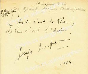 LIFAR SergePensée autographe signée, adressée à H. Corbière. 27 juillet 1941 ; 1/2 page in-folio.Sa maxime de vie: « L’art c’est la vie, La vie c’est l’artSerge Lifar 1941 ».