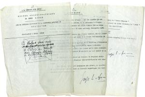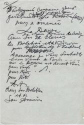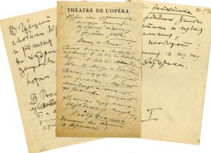 LIFAR SergeTapuscrit signé 2 fois, avec corrections autographes, intitulé « À la mémoire d'un héros [Napoléon] ». « Épopée choréographique de Serge Lifar. Sur le deuxième mouvement de la Symphonie héroïque de Beethoven ». Sans date ; 3 pages in-4°. « Ce ballet sera créé à Paris au Théâtre des Champs-Élysées le 20 février 1946 ». « L'empereur va mourir. L'aigle qui fut symbole de son rêve de gloire avant d'être emblème de sa puissance l'aigle est à ses côtés afin de déployer ses ailes fidèles sur la revue suprême : celle des souvenirs et pour celle-ci, Bonaparte revêt la pourpre de Napoléon. » Suit le scénario du ballet : « Sa jeunesse, [ ] la campagne d'Égypte, [ ] la pompe du couronnement, [ ] le sabre d'un grenadier, [ ] le Drapeau : témoins héroïques de cent victoires. Ses lèvres maintenant prononcent une prière, la dernière. Et il s'enveloppe lui-même dans ce linceul magnifique : les trois couleurs qu'il immortalisa. » On joint un tapuscrit signé de ses initiales, intitulé « Prière sur le 2E mouvement de la 7e symphonie de Beethoven » et 2 notes autographes. Ensemble intéressant.