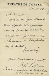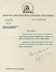 LIFAR SergeLettre autographe signée, adressée à Nina Vyroubova. Paris, le 5 octobre 1955 ; 1 page in-4°. En tête imprimé « Réunion des Théâtres Lyriques Nationaux ».« Voulez-vous me faire lhonneur daccepter de faire partie du Comité constitué pour célébrer le 25e anniversaire de la mort dAnna Pavlova. »