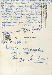 LIFAR SergeCarte autographe signée, adressée à M. et Mme Vyroubova. Glion, Suisse, 22 décembre 1981 ; 1 page in-12 oblongue au dos d'une carte postale de Noël. « Avec mes meilleurs vux pour un Joyeux Noël et Bonne et heureuse Année 1982. »