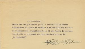 LIBRETTISTES.Ensemble de 4 pièces signées. BRAMMER Julius [Sehradice, 1877 - Juan-les-Pins, 1943], librettiste autrichien. 2 pièces signées concernant les droits de La Bayadere. GRÜNWALD Alfred [Vienne, 1884 - New York, 1951], librettiste autrichien. 2 pièces signées concernant les droits de La Bayadere. On joint une pièce signée sur les droits de « La dame en noir ».