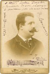 LEONCAVALLO RuggieroPhotographie autographe signée avec portée musicale. Milan, 23 mars 1894 ; 107 x 160 mm. Photographie format cabinet de W.C. Hans, Vienne, Autriche. Belle photographie dédicacée à Mme Bertha Doepler : « Souvenir de son passage à Milan par son ami dévoué R. Leoncavallo ». La portée musicale est un morceau de I Medici, opéra en 4 actes de R. Leoncavallo (créé le 9 novembre 1893 au Théâtre Dal Verme à Milan). Très jolie pièce.