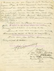 LANNES Jean, duc de MontebelloLettre autographe signée adressée au père de son épouse alors admisnitrateur des forêts. . Lisbonne, 9 nivose an 12 (31 décembre 1803) ; 2 pages in-4° avec ajout d’une page autographe signée « Louise » sur la 3 ème pages, adresse et cachet au dos. « Voilà deux courier mon ami que nous ne recevons pas de nouvelles de Paris ; je pense que je ne puis attribuer ce retard qu’à la mauvaise administration des postes ou au mauvais temps. je vous empris ne laissez jamais un courrier sans nous écrir vous, ou madame Guéhéneuc ; je vous ai expédié [au...] avec le traité de neutralité que vous aurez sans doute trouvé bon, j’attend la ratification du 1er consul. Les anglais ont donné hier un nouvel exemple de leur respect pour les nations, une frégate c’est jetée sur un batiment portugais d’envion 200 hommes, l’equipage qui était de [...] hommes à voulu faire des observations au capitaine anglais qui à répondu en ordonnant à ces matelos de faire feu, quatre pauvres portuguais ont été tués. Je vous demande mon ami le [...] que cela a fait dans Lisbonne, le prince Régent que j’ai vu aujourd’hui est très sensible à cette insulte, il a proposé de demander une [satisfaction eclatante] au gouvernement britanique, en attendant il a consigné la frégate dans le port de Lisbonne ou l’affaire c’est passé. Je fais part de cet évènement au premier consul, qui en sera sans doute indigné, cette [...] anglaise à soulevé tous les habitants de Lisbonne à tel point que si le prince n’obtenait pas une grande satisfaction ils seraient capables de mettre le feu à cette frégate, au reste il n’y aurait pas grand mal, les voila en [accord] à toutes les nations ; Le prince m’aime toujours beaucoup . Je l’aime aussi bien, je le vois encore tous les deux ou trois jours. Il se chante demaine un [...] à sa Chapelle de [...] il me fait l’honneur de m’y inviter ainsi que Louise enfin mon cher ami il m’est impossible de vous dire l’amitié existe entre nous deux, ce qui n’amuse par les anglais, leur rage vient de la : adieu mon ami embrassé le brave (docteur) pour moi dites lui que je l’aime bien, je ne doute pas que le premier consul ne lui [...] rendu son billet. » Cette magnifique lettre est écrite lorsque Lannes est Ambassadeur de France à Lisbonne et que le tensions avec les anglais sont grandissantes.