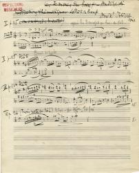 JOLIVET AndréManuscrit musical autographe signé, La Flûte du Bœuf [K142], 1948 ; titre et 2 pages in-4.Musique inédite pour flûte pour Les Femmes du Bœuf de Jacques Audiberti, créée à la Comédie Française (salle du Luxembourg), le 23 novembre 1948, dans une mise en scène de Jean Debucourt et des décors de Raymond Peynet, Louis Seigner jouant le rôle du Bœuf.Jolivet a écrit cinq brèves interventions musicales pour la flûte (durée totale : 1’45’’). Le manuscrit, à l’encre noire sur papier à 16 lignes, a servi pour les représentations, comme en témoignent des notes au crayon ; il porte les cachets de dépôt à la SACEM, le 20 décembre 1948.On joint le manuscrit de premier jet au crayon (1 page in-fol., à 22 lignes), au dos d’esquisses pour la 3e des Trois Complaintes du soldat [K91].