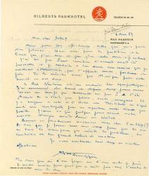 HONEGGER ArthurLettre autographe signée adressée à Marcel Mihalovici. 2 août 1954 ; 1 page in-4°, enveloppe jointe. Sur papier à en-tête du Hilberts Parkhotel.« Mon cher Schip, merci pour ton affectueuse lettre qui m’a fait bien plaisir. Merci aussi pour la partition et le livret que j’ai reçu et que j’ai relu avec vif intérêt. J’ai su par Paul combien l’accueil avait été favorable et je souhaite à ton oeuvre une carrière que je voudrais éblouissante, qui t’apporte renom, fortune et paix. Tu le mérites ainsi que Monique pour votre travail et vos dons. Le Bad Nauheim est un endroit très sympathique. J’ai commencé des bains et depuis deux jours nous avons un temps qui ressemble un peu à de l’été. Avant ce n’était que pluies, vents et ouragans. Il y a toujours à côté de l’hôtel une Trin la halle ou l’après-midi une Kim kapelle joue un répertoire aussi désuet que possible. J’avais vu que quelques jours avant notre arrivée, Monique avait donné un récital. Bonnes et fructueuses vacances mon cher C ou Ships (!) tu sais que je forme tous mes voeux pour que tu aies en tout la récompense que mérite ta gentillesse, ta courtoisie et ton grand talent de créateur.Je vous embrasse tous deux en vieille affection.A. Honegger.Tu sais que si d’une façon ou d’une autre je puis te rendre service pour quoi que ce soit, fais-moi l’amitié de me le dire.»Au dos 4 lignes autographes signées de Laura Honegger.On joint une lettre autographe signée de Laura Honegger dans sa vieillesse.
