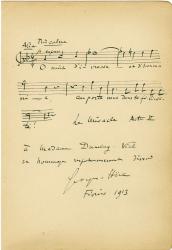 HÜE GeorgesExtrait musical autographe signé, dédicacé à Madame Dumény-Vial. Février 1913 ; 2 portées musicales, extraits de son opéra Le Miracle, acte II. « À Madame Dumény-Vial en hommage respectueux dévoué. Georges Hüe ».