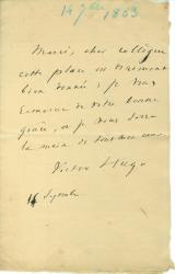HUGO VictorLettre autographe signée adressée à un collègue. 14 septembre 1883 ; 1 page in-4°. « Merci mon cher collègue, cette place est vraiment bien donnée ; je vous remercie de votre bonne grâce, et je vous serre la main de tout mon coeur. »