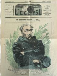 HOFF IgnaceGravure sur bois en couleurs de la première page du journal “ L’Eclipse ”. Dimanche, 19 janvier 1873. 1 page in-folio, traces de pliures. “ Le sergent Hoff, par Gill ” , portait de Ignace Hoff, bras croisés et le képi à la main. Ignace Hoff celèbre sous-officier, qui s’est illustré pendant le siège de Paris pendant la guerre de 1870. Il parvient à déloger les allemands de l’île des loups à Nogent sur Marne. Il fit aussi des embuscades la nuit qui couta la vie à 27 prussiens.