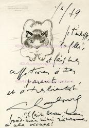 HAMBOURG AndréLettre autographe signée, ornée d’un dessin représentant un chat. Saint-Rémy de Provence, le 1er avril 1979 ; 1 page in-4°. « Je t’embrasse “la fille”, et fais mes affections à tes parents... et à très bientôt ! »En post-scriptum : « Il fait beau, mais froid, mais Mimi ronronne et cela occupe ! »