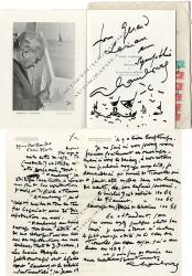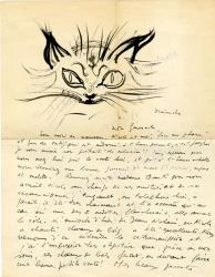 HAMBOURG AndréLettre autographe signée, adressée au général Bank, directeur d’une revue. 2 pages in-4°, avec dessin autographe représentant son chat Zadig, en tête de la lettre. « Nous voici de nouveau, Nicole et moi, “face au phare” et près de Zadig qui est endormi à l’heure présente, c’est pourquoi je vous envoie son portrait “de mémoire” ! […] Remerciez Madame Bank pour son accueil. Nicole me charge de ses amitiés et de sa reconnaissance. […] L’émission d’hier de Jean Nohain où Nicole a chanté Chevaux de bois a été excellente. Nous venons d’entendre la retransmission et j’ai l’impression très objective que, grâce à vos soins, ces chevaux de bois feront ou devraient faire une bonne petite route ! » Il compte se remettre au travail, lui enverra la photographie d’une des deux toiles de l’automne et le remercie pour tout le mal qu’il se donne pour sa femme et pour lui.