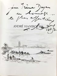 HAMBOURG AndréLettre autographe signée. [Paris], le 1er octobre 1980 ; 2 pages in-4°. « Plusieurs ouvrages (modestes) et études m’ont en effet été consacrés, dont : Hambourg par Michel Droit édité par Pierre Cailler, à Lausanne en 1967 avec plus de 200 reproductions mais épuisé je crois, et difficile à trouver. […] Hambourg au musée de la Marine, ouvrage très bien édité à l’occasion de ma rétrospective au musée, en 1977 avec des reproductions en noir et en couleurs, textes de J. Ducros, préfacé par Luc Marie Bayle... Quelques autres petits ouvrages ont également paru, dont Hambourg et la réhabilitation sentimentale par Jean Bouret... mais il y a bien longtemps. Je ne sais si vous pouvez vous procurer facilement ces ouvrages. Mais si vous le désirez, à mon retour d’un prochain voyage aux USA, je demanderai au musée de Trouville qui en a peut-être encore dans son bureau de vente, de vous les faire parvenir. »On joint la plaquette de son exposition Voyages à la mairie de Trouville-sur-Mer. Juillet-août 1973, dédicacée : « Pour Gérard Leman, en sympathie. Hambourg », agrémentée d’un dessin au feutre noir représentant des voiliers sur la mer.